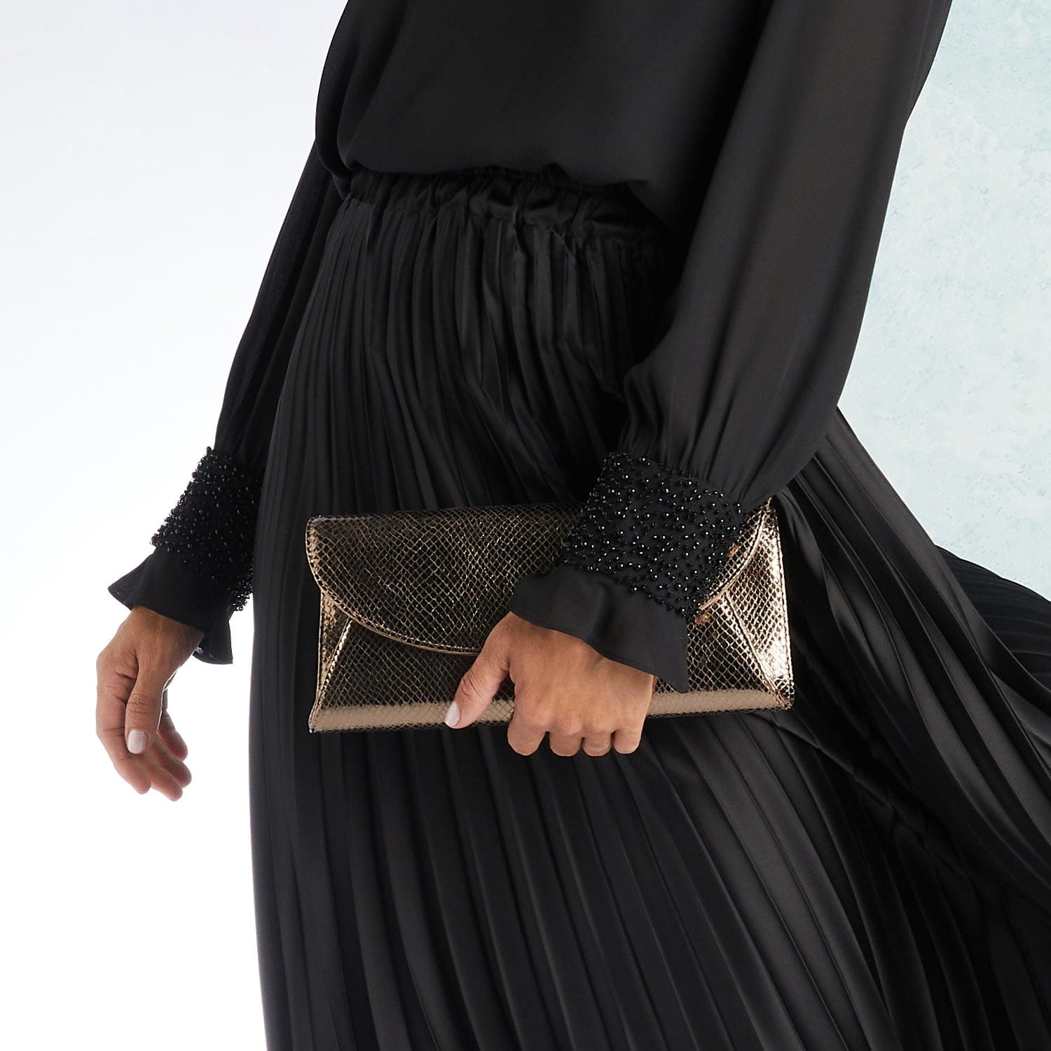 Match made in heaven! This soft envelope clutch bag is handcrafted from Italian bronze snake print leather and features a detachable gold chain chain so you can wear it as a clutch or shoulder bag.