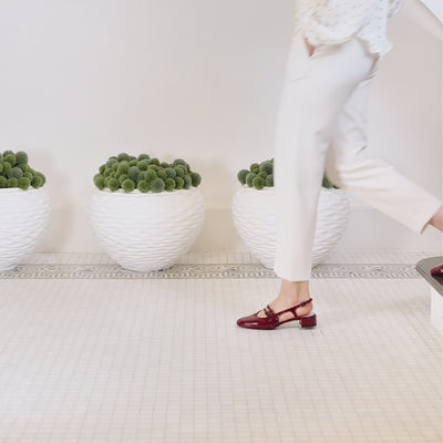 Make your entrance in 'Opera', our slingback Mary Jane flats in rich burgundy patent leather. This striking style features elegant double buckles and a secure slingback strap for effortless wear. The deep wine tone and high-shine patent finish adds instant sophistication to your closet, elevating any outfit with its luxurious hue. Triple-layered underfoot cushioning, a wide toe box, and hidden stretch panel for bunions deliver exceptional comfort that lasts from morning to night.