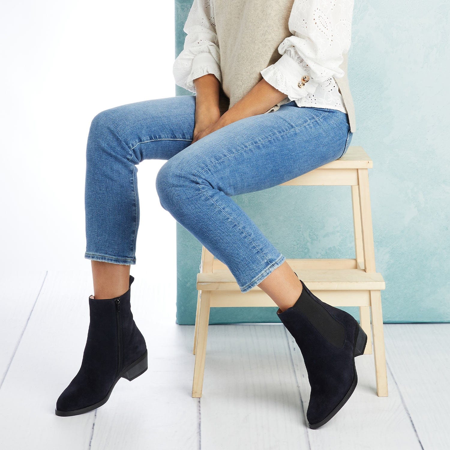 'Rider' is here to carry you into the new season! Elasticated side panels combine with a classic Western heel and elegant silhouette to create the ultimate fusion of Chelsea boot convenience and cowgirl chic. Handcrafted in Italy from soft suede, the versatile navy tone works seamlessly with this season's rich palette and is super easy to style - perfect for those who want a bit of color in a cowboy Chelsea boot that works with everything!