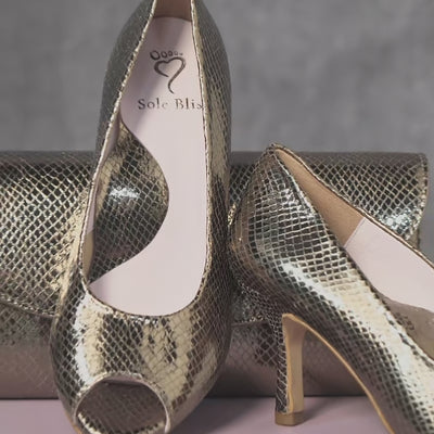 Look sensational in 'Selena'! These wonderful wide-fit peep-toe heels are a never-before-seen Sole Bliss design, with the support and security of a closed-back heel combined with a flattering open-toe cut-out. Sleek bronze snake print leather and a wearable height pairs with a wide toe box, triple-layered underfoot cushioning, anti-pronating arch support and a stretch panel for bunions and difficult joints to make these elegant peep-toe heels the most comfortable you'll ever wear!