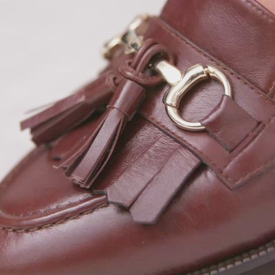 It's time for 'Tanner'! These traditional loafers for women are handcrafted from supple chestnut leather and feature new metallic hardware and tassel detailing for a smart and classic look, as well as a seam-free leather lining for ultimate comfort. With arch support, underfoot cushioning and a bunion bed stretch panel, these wide-fitting loafers are also great for painful feet.